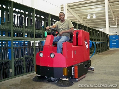 Factory Cat's XR Rider Floor Scrubber Dryers are tough, compact scrubbers that offer the great productivity of Rider machines but with better maneuverability than Walk Behinds. The Factory Cat XR Rider Floor Scrubbers have a powerful drive motor that can climb steep ramps and comes standard with heavy duty tires. Features of the drive system include: automatic parking brake and reducing of transport speed while scrubbing or reversing to maintain life of the squeegees.