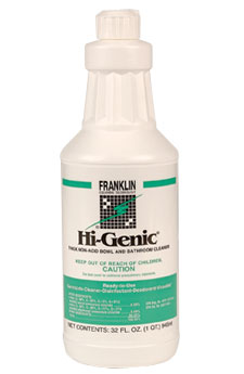 Our best-selling restroom bowl cleaner. HI-GENICĀ® is a ready-to-use, thick non-acid bowl and bathroom cleaner, disinfectant, deodorant, mildewstat and virucidal cleaner that kills HIV-1 (AIDS). Kills Pandemic 2009 H1N1 Influenza A virus (formerly called swine flu). HI-GENICĀ® has a very pleasant, long lasting fragrance and is completely safe to use for daily maintenance on all non-porous bathroom surfaces and fixtures. It contains no harmful alkalis or abrasives, will not etch or pit metal or porcelain fixtures, and will not harm carpet if accidentally spilled.